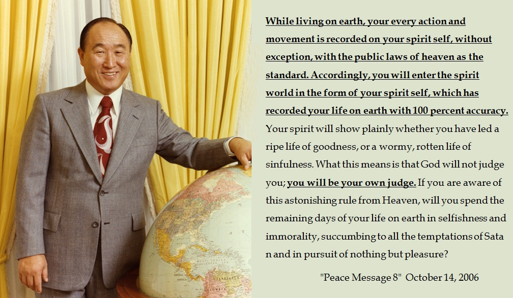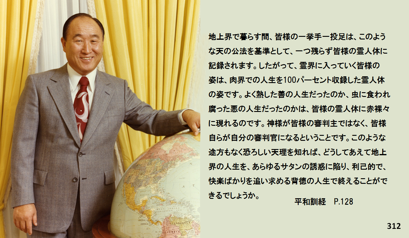 地上界で暮らす間、皆様の一挙手一投足は、このような天の公法を基準として、一つ残らず皆様の霊人体に記録されます。したがって、霊界に入っていく皆様の姿は、肉界での人生を100パーセント収録した霊人体の姿です。よく熟した善の人生だったのか、虫に食われ腐った悪の人生だったのかは、皆様の霊人体に赤裸々に現れるのです。神様が皆様の審判主ではなく、皆様自らが自分の審判官になるということです。