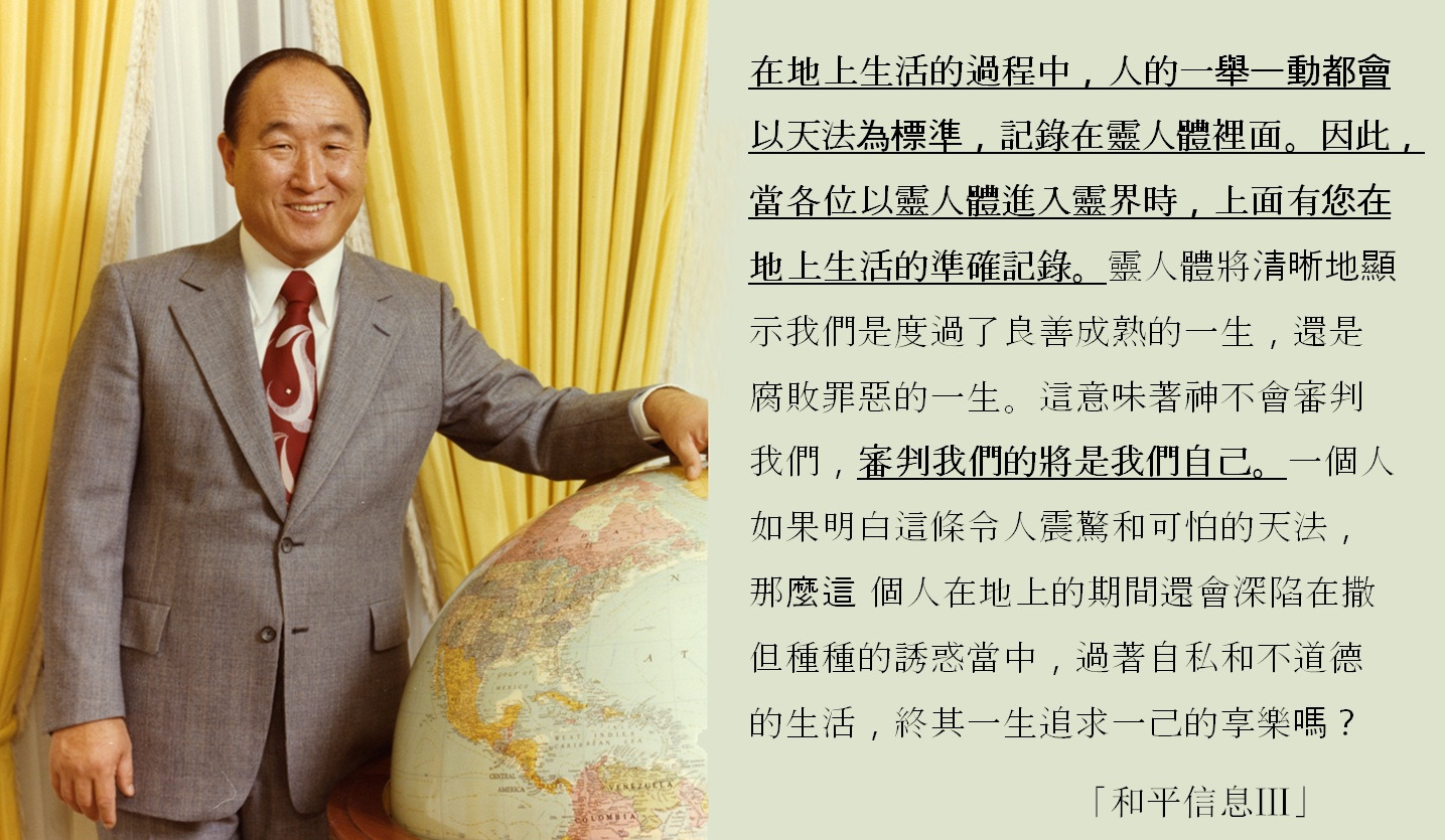 在地上生活的過程中,人的一舉一動都會以天法為標準,記錄在靈人體裡面。因此,當各位以靈人體進入靈界時,上面有您在地上生活的準確記錄。靈人體將清晰地顯 示我們是度過了良善成熟的一生,還是腐敗罪惡的一生。這意味著神不會審判我們,審判我們的將是我們自己。一個人如果明白這條令人震驚和可怕的天法,那麼這 個人在地上的期間還會深陷在撒但種種的誘惑當中,過著自私和不道德的生活,終其一生追求一己的享樂嗎?即使冒著生命的危險也應該避免傷害自己的靈人體。請 記住這一個真理:一個人去天國還是下地獄,取決於自己每時每刻的思想與言行。
