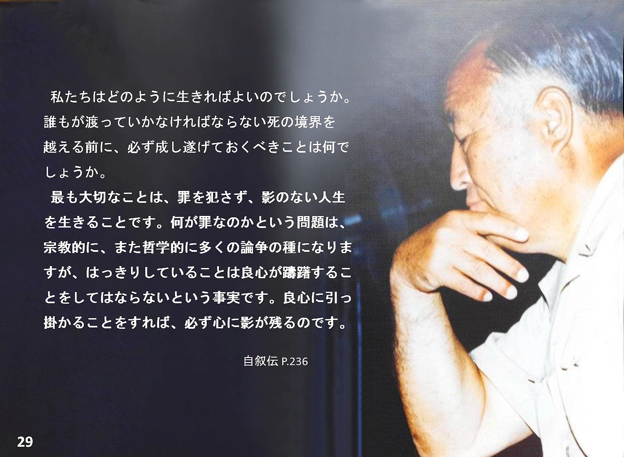 最も大切なことは、罪を犯さず、影のない人生を生きることです。何が罪なのかという問題は、宗教的に、また哲学的に多くの論争の種になりますが、はっきりしていることは良心が躊躇することをしてはならないという事実です。良心に引っ掛かることをすれば、必ず心に影が残るのです。