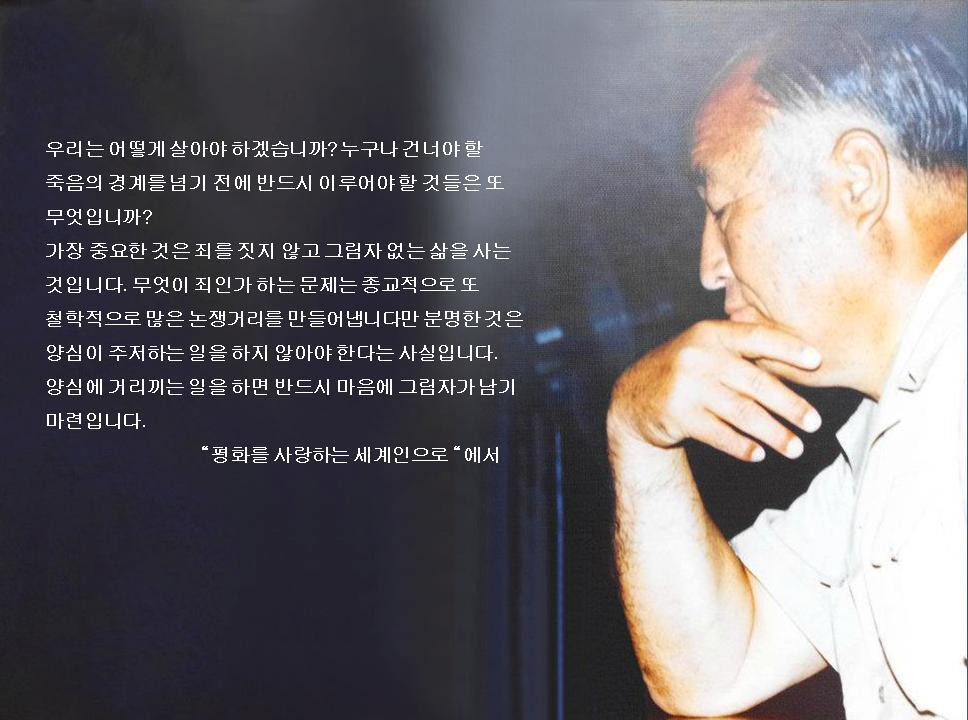가장 중요한 것은 죄를 짓지 않고 그림자 없는 삶을 사는 것입니다. 무엇이 죄인가 하는 문제는 종교적으로 또 철학적으로 많은 논쟁거리를 만들어냅니다만 분명한 것은 양심이 주저하는 일을 하지 않아야 한다는 사실입니다. 양심에 거리끼는 일을 하면 반드시 마음에 그림자가 남기 마련입니다.