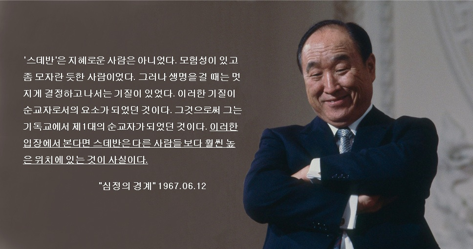 '스데반'은 지혜로운 사람은 아니었다. 모험성이 있고 좀 모자란 듯한 사람이었다. 그러나 생명을 걸 때는 멋지게 결정하고 나서는 기질이 있었다. 이러한 기질이 순교자로서의 요소가 되었던 것이다. 그것으로써 그는 기독교에서 제1대의 순교자가 되었던 것이다. 이러한 입장에서 본다면 스데반은 다른 사람들 보다 훨씬 높은 위치에 있는 것이 사실이다. (18-281)