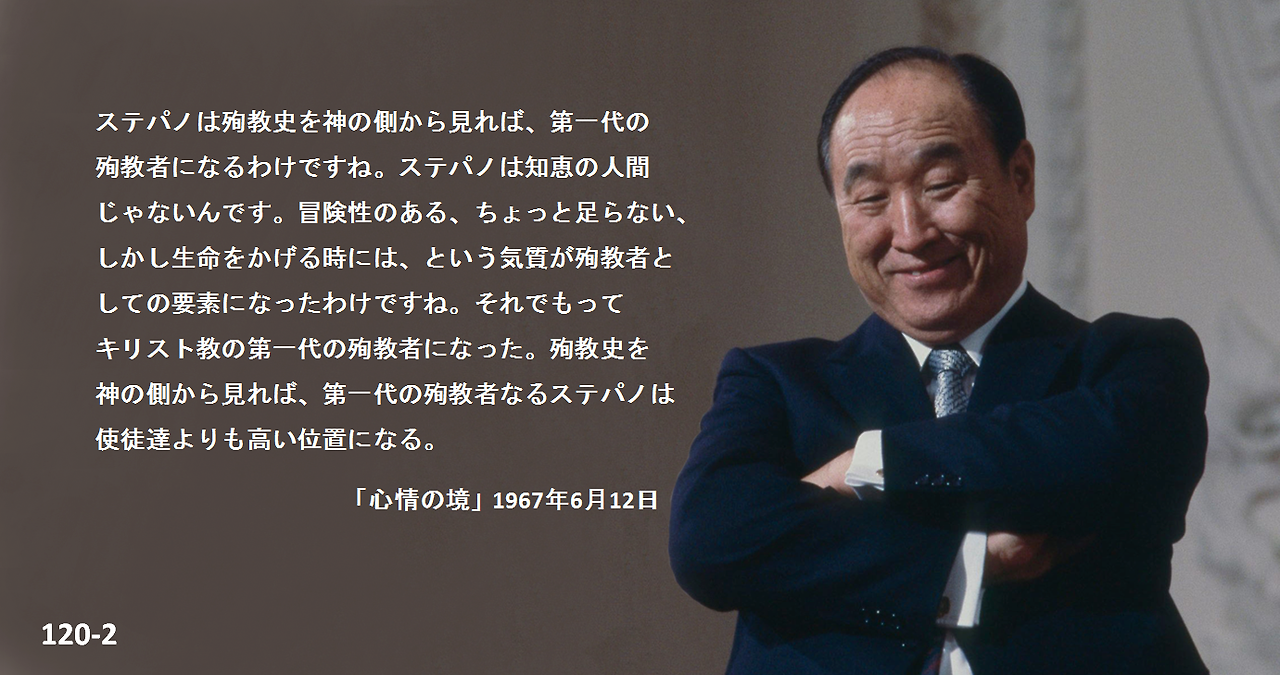 この統一教会の誰が第一代の殉教者になるか。我々は世界復帰のために世界的戦いをしなければならない。善の戦いを展開しなげればならない。その過程におきましては、ある時には、攻撃せられて、思わざる死の立場に立つ人もいるでしょう。その人が第一代の殉教者になるわけですね。