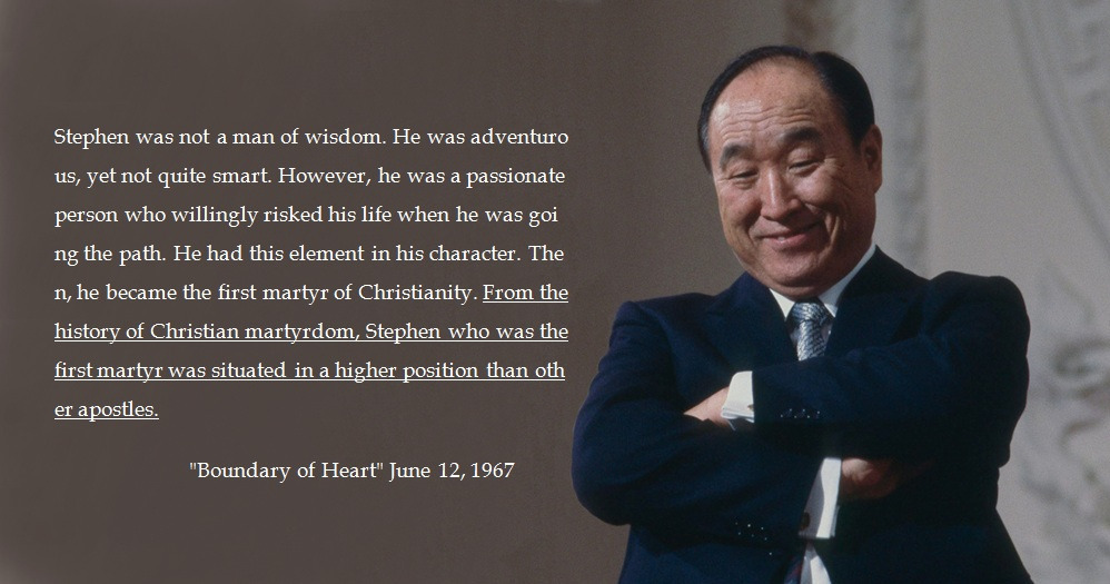 Who will be the first martyr of the Unification Church? We are going to engage in the worldwide battle to restore the world. We must get involved in the fight for goodness. In the process, we are attacked—then some of us may die unexpectedly. This person will become the first martyr. Stephen was the first martyr of God’s history of martyrdom. Stephen was not a man of wisdom. He was adventurous, yet not quite smart. However, he was a passionate person who willingly risked his life when he was going the path. He had this element in his character. Then, he became the first martyr of Christianity. From the history of Christian martyrdom, Stephen who was the first martyr was situated in a higher position than other apostles.