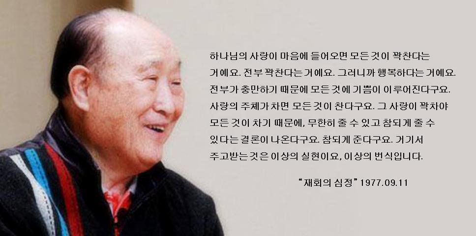 그래, 사랑의 주체가 차면 모든 것이 찬다구요. 그 사랑이 꽉차야 모든 것이 차기 때문에, 무한히 줄 수 있고 참되게 줄 수 있다는 결론이 나온다구요. 참되게 준다구요. 거기서 주고받는 것은 이상의 실현이요, 이상의 번식입니다. 그래요, 안 그래요?「그렇습니다」사랑의 세계는 거리를 초월하지요. 사랑이라는 것이 얼마나 속도가 빠르냐? 그것은 빛도 못 따라 간다는 거예요. 제일 빠른 것이 사랑이라는 거예요. 제일 밝은 것도 사랑이예요. 제일 완전한 것도 사랑이예요. 제일 완전히 찬 것도 사랑이예요.