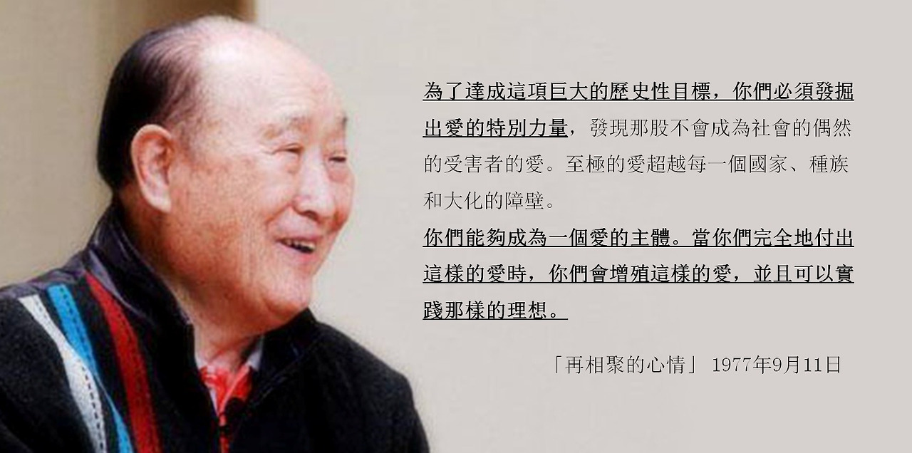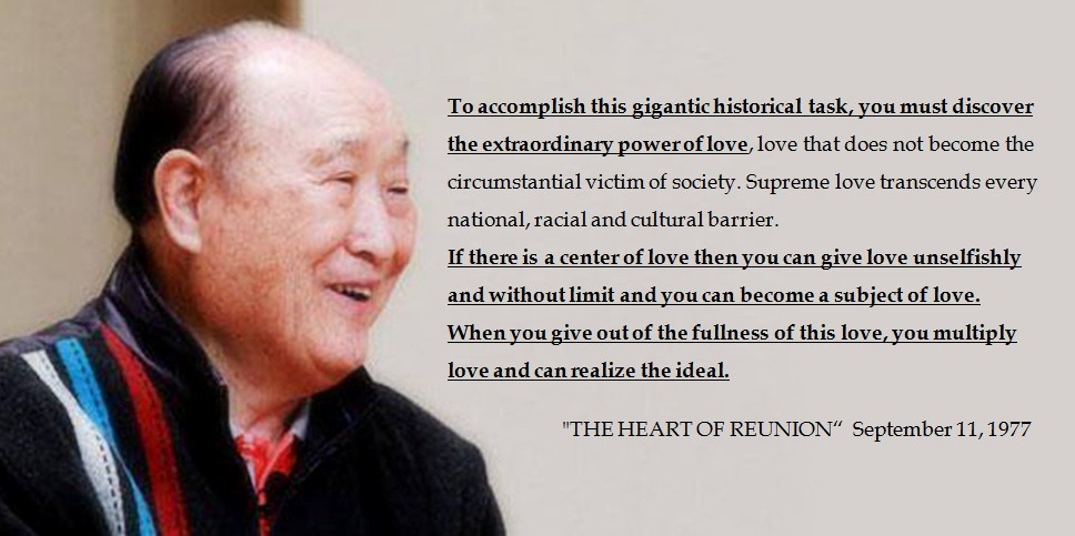 為了達成這項巨大的歷史性目標,你們必須發掘出愛的特別力量,發現那股不會成為社會的偶然的受害者的愛。至極的愛超越每一個國家、種族和大化的障壁。人們總是在談論愛,但是單單是人類的愛永遠無法完成天宙合一的那項使命。因此,統一教繞著那唯一的愛慶祝,繞著神的愛和心情慶祝。我們是歷史上第一個談到神的心情的團體。