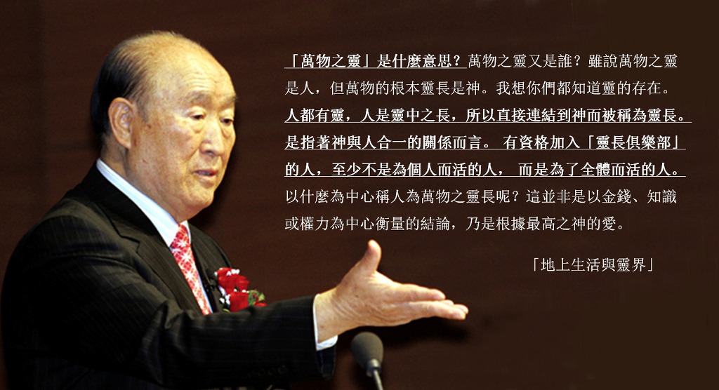 靈長是與神相通的。人雖然是萬物之靈,但並非所有的人都是靈長,能成為靈長的,是有特定基準的人。有資格加入「靈長俱樂部」的人,至少不是為個人而活的人, 而是為了全體而活的人。神希望以那種人為中心實現祂的理想。到時候天國將成為誰的天國呢?不是神的天國,而是那個人的天國。(32–136, 1970.7.5)