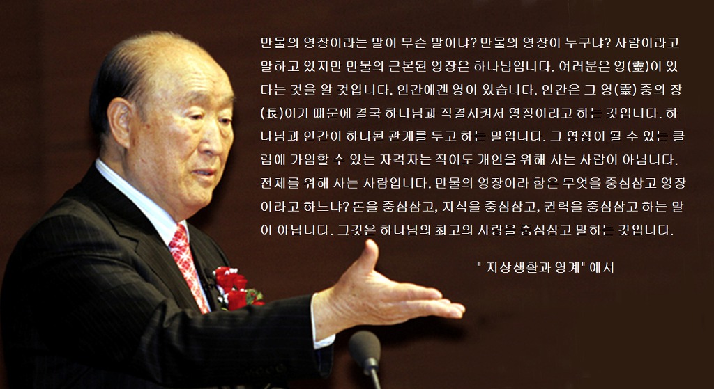 만물의 영장이라 함은 무엇을 중심삼고 영장이라고 하느냐? 돈을 중심삼고, 지식을 중심삼고, 권력을 중심삼고 하는 말이 아닙니다. 그것은 하나님의 최고의 사랑을 중심삼고 말하는 것입니다. (210-309, 1990.12.27) p.554