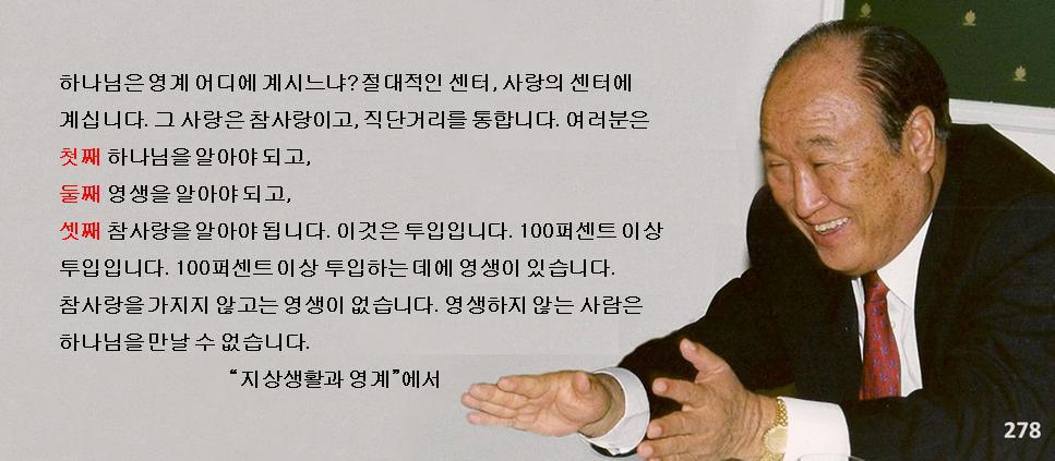 하나님은 영계 어디에 계시느냐? 절대적인 센터, 사랑의 센터에 계십니다. 그 사랑은 참사랑이고, 직단거리를 통합니다. 여러분은 첫째 하나님을 알아야 되고, 둘째 영생을 알아야 되고, 셋째 참사랑을 알아야 됩니다. 이것은 투입입니다. 100퍼센트 이상 투입입니다. 100퍼센트 이상 투입하는 데에 영생이 있습니다. 참사랑을 가지지 않고는 영생이 없습니다. 영생하지 않는 사람은 하나님을 만날 수 없습니다. (205-129, 1990.7.29) p.569
