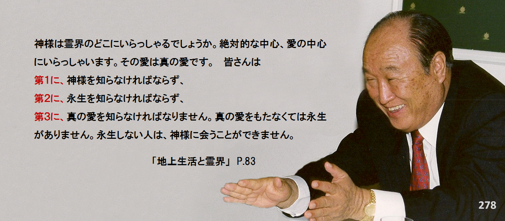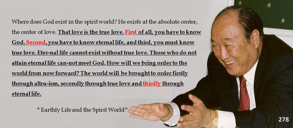 神様は霊界のどこにいらっしゃるでしょうか。絶対的な中心、愛の中心にいらっしゃいます。その愛は真の愛です。 皆さんは 第1に、神様を知らなければならず、第2に、永生を知らなければならず、第3に、真の愛を知らなければなりません。真の愛をもたなくては永生がありません。永生しない人は、神様に会うことができません。