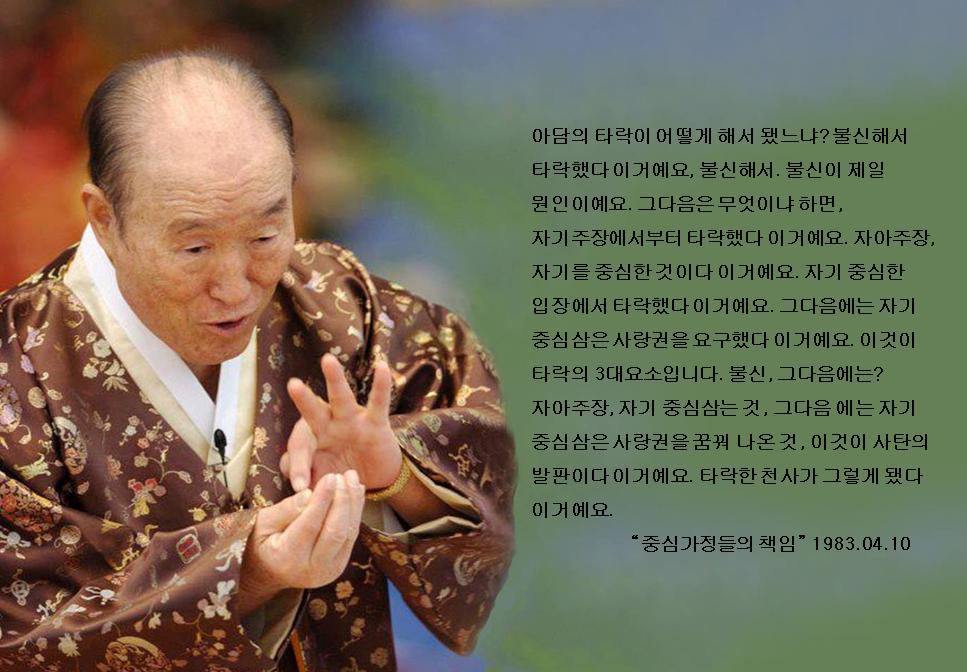 아담의 타락이 어떻게 해서 됐느냐? 불신해서 타락했다 이거예요, 불신해서. 불신이 제일 원인이예요. 그다음은 무엇이냐 하면, 자기주장에서부터 타락했다 이거예요. 자아주장, 자기를 중심한 것이다 이거예요. 자기 중심한 입장에서 타락했다 이거예요. 그다음에는 자기 중심삼은 사랑권을 요구했다 이거예요. 이것이 타락의 3대요소입니다. 불신, 그다음에는? 자아주장, 자기 중심삼는 것, 그다음 에는 자기 중심삼은 사랑권을 꿈꿔 나온 것, 이것이 사탄의 발판이다 이거예요. 타락한 천사가 그렇게 됐다 이거예요.