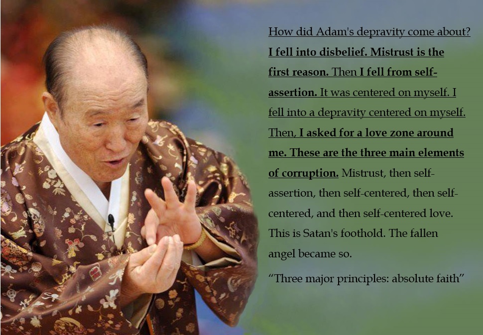 アダムの堕落はどのようにして起きたのでしょうか。不信して堕落したのです。不信が第一の原因です。その次は、自己主張から堕落しました。自分を中心としたのです。自分を中心とした立場で堕落しました。その次には、自分を中心とする愛圏を要求したのです。これが堕落の三大要素です。不信、その次には自己主張、自分を中心とすること、その次には、自分を中心とする愛圏を夢見ること、これがサタンの足場です。堕落した天使がそのようになったのです。