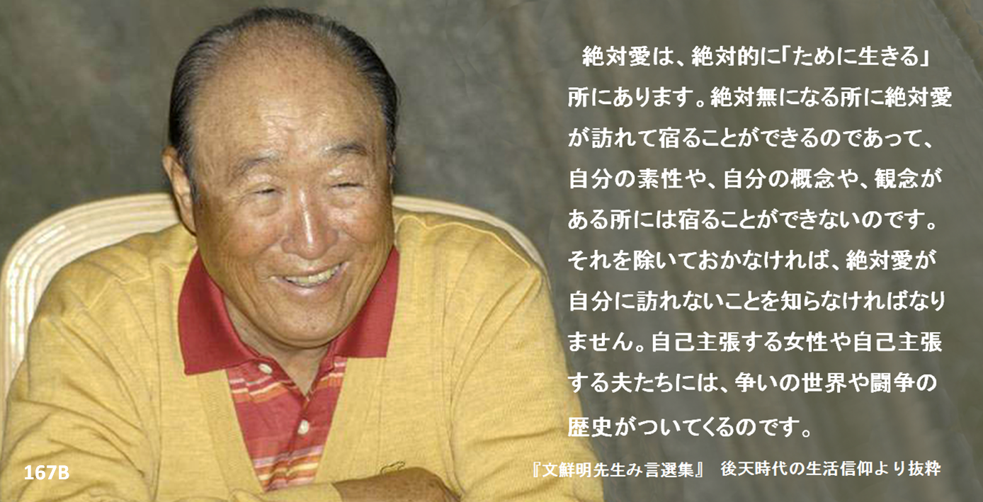 絶対愛は、絶対的に「ために生きる」所にあります。絶対無になる所に絶対愛が訪れて宿ることができるのであって、自分の素性や、自分の概念や、観念がある所には宿ることができないのです。それを除いておかなければ、絶対愛が自分に訪れないことを知らなければなりません。自己主張する女性や自己主張する夫たちには、争いの世界や闘争の歴史がついてくるのです。(284-196)