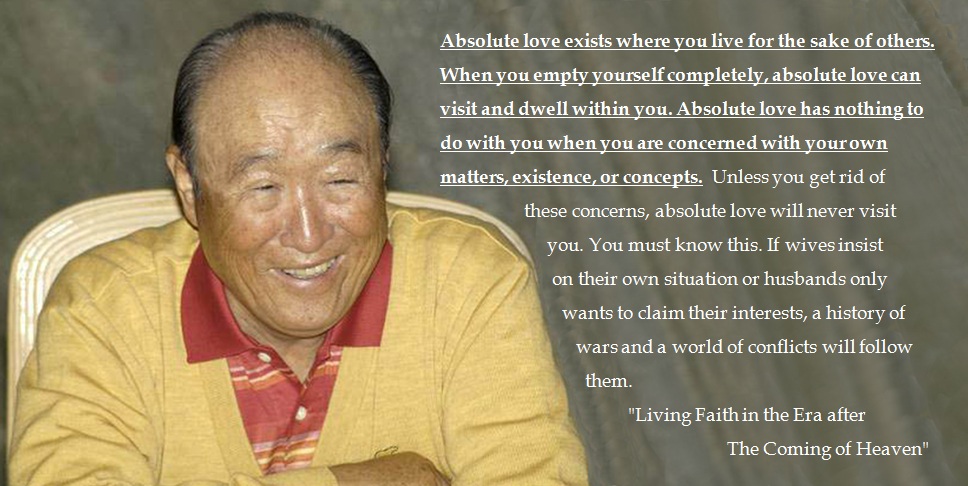 Absolute love exists where you live for the sake of others. When you empty yourself completely, absolute love can visit and dwell within you. Absolute love has nothing to do with you when you are concerned with your own matters, existence, or concepts. Unless you get rid of these concerns, absolute love will never visit you. You must know this. If wives insist on their own situation or husbands only wants to claim their interests, a history of wars and a world of conflicts will follow them.
