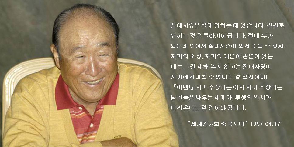 절대사랑이라는 것은 상대를 절대시하는 데서 이루어지는 것입니다. 그 자리에서 남자가 여자를 절대적으로 사랑할 수 있는 주인이 되고, 여자가 절대적 사랑의 주인이 되는 것입니다. 그렇기 때문에 그 사랑의 주인은 자기로 말미암아 찾아지는 것이 아니라 상대로 말미암아 찾아진다는 것을 똑똑히 알아야 되겠어요. (301-74)