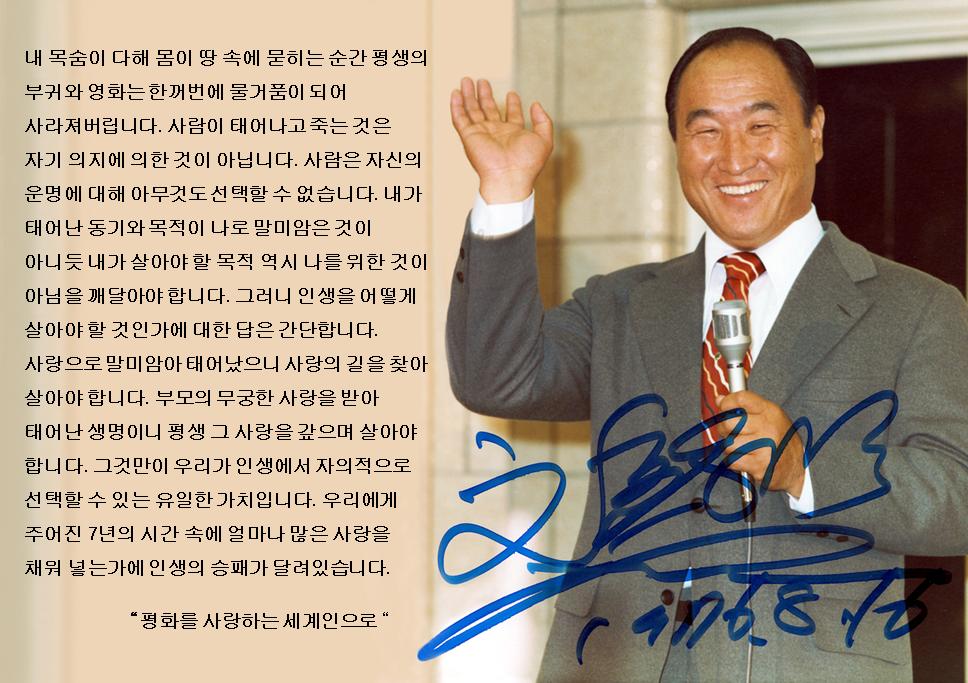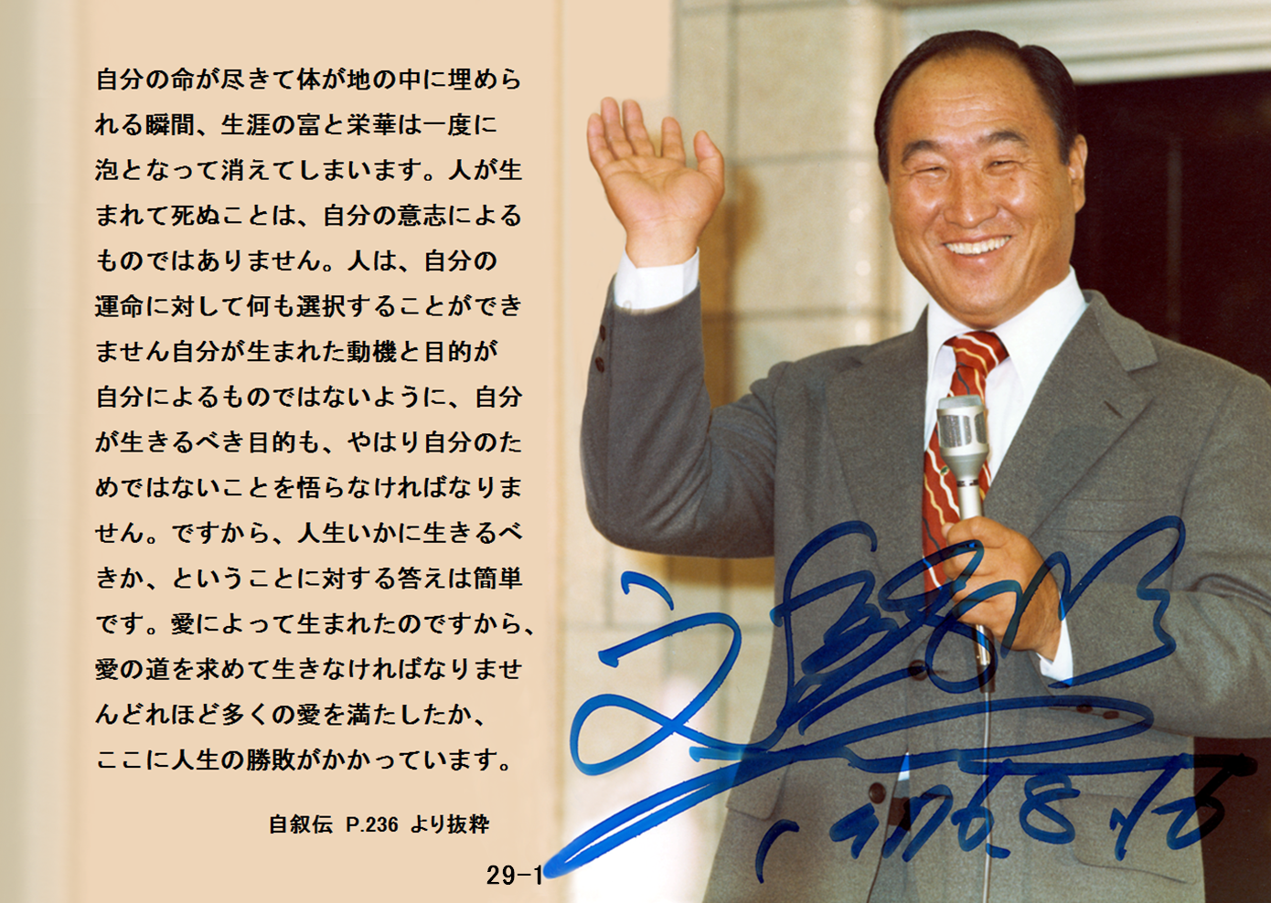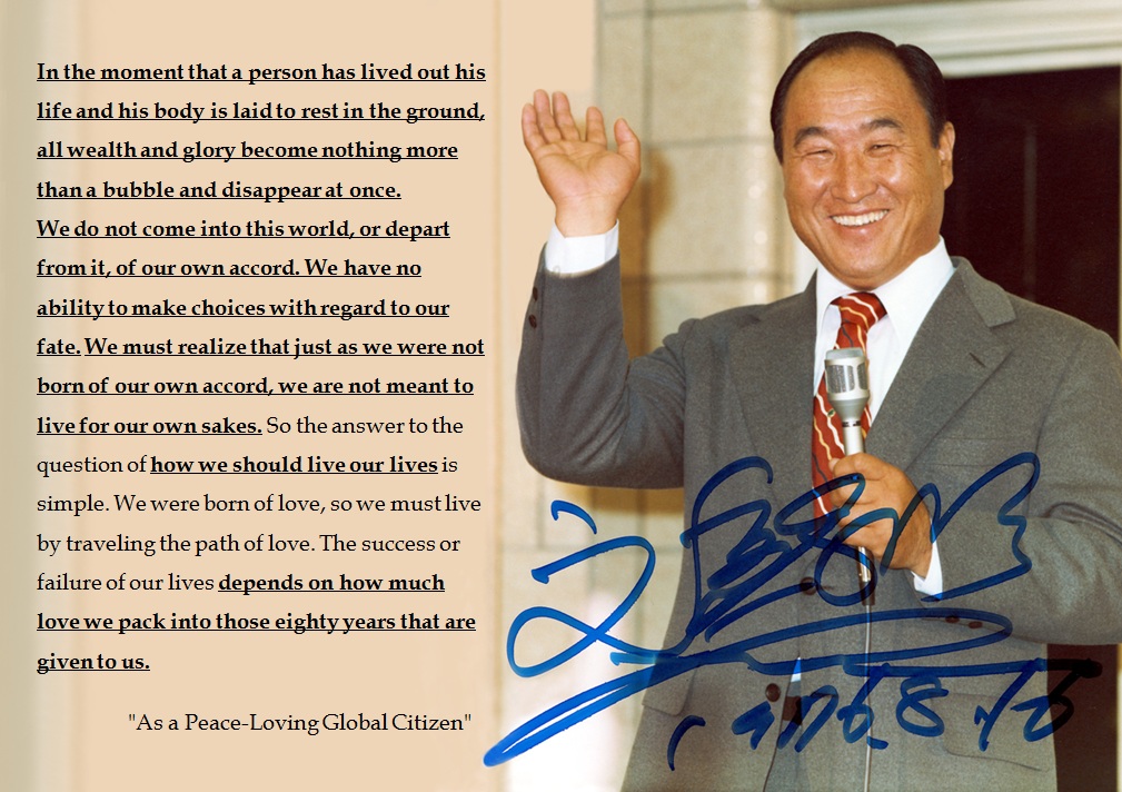 ですから、人生いかに生きるべきか、ということに対する答えは簡単です。愛によって生まれたのですから、愛の道を求めて生きなければなりません。父母の果てしなく深い愛を受けて生まれた命なので、生涯その愛を返して生きなければならないのです。それこそが、私たちが人生において自らの意志で選択できる唯一の価値です。私たちに与えられた7年という時間の中に、どれほど多くの愛を満たしたか、ここに人生の勝敗がかかっています。