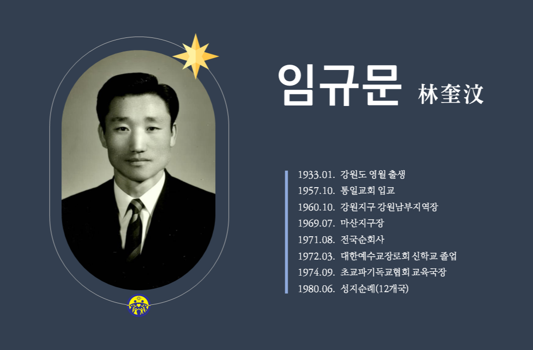 | 証言 - [28] 林奎文 - 私の支柱となられた神様 3. 夏季伝道は旌善で - 1 1 1次の夏季伝道では、旌善郡の咸白という炭鉱地帯に配置された。 これまで開拓伝道生活をし、また別の荒野開拓のために出て行く私にお金がある由もない。 2 原理の本とランニングシャツ一枚を鞄に入れて60里の道を歩いて咸白に到着したら夜だった。 知り合いも寝床もなく、仕方なく咸白国民学校の廊下にこっそり入り鞄を前に置いて空を仰いだ。 3 天がくださったのは涙の祈りだけだった。「アボジ!」この一言が夜を明かさせ、その涙の祈りが私を慰め、また希望をくれた。 3日間寝泊まりする部屋を確保しようと歩き回ったが、得らえないまま山の角に座っていると、隣にある城隍堂¹も天の威信を構わなければ、居所にしたかったが、そうはできなかった。 4 私の状況を見、「空の鳥も宿るところがあり、狐も穴があるのに…···」と嘆いたイエス様の状況を考えてみると、イエス様がかわいそうで、ポムネコル土塀屋を建てられた先生の心情を思うと、孤独な神様の路程を肌で感じた。その瞬間、どっとあふれる涙を止める術がなかった。 5 全身が熱く燃え上がり熱い火の熱気に耐えられなかった刹那、空から音声が聞こえてきた。「大きな古木がある家を訪ねなさい」と教えて下さった。 6 その夜を山で過ごし、翌朝に村に降りてケヤキの古木がある家を訪ねて挨拶をすると、御主人は咸鏡道元山の人で解放直後に南下して鉱山を経営した後、休んでいる篤実な長老教信者だった。 7 私が啓蒙に来た趣旨と目的を話すと、主人は喜んで自分の家に入っている下宿人を他の家に移させ、私をその部屋で生活させた。私は毎朝早く起きてあちこちにポスターを貼り、講義場所を2ヶ所に決めておき、昼と夜の2回講義をするため、忙しく歩き回った。 ¹城隍堂: 성황신(한국 신화에 나오는 마을의 수호여신)을 모시고 제사를 지내는 집 |
