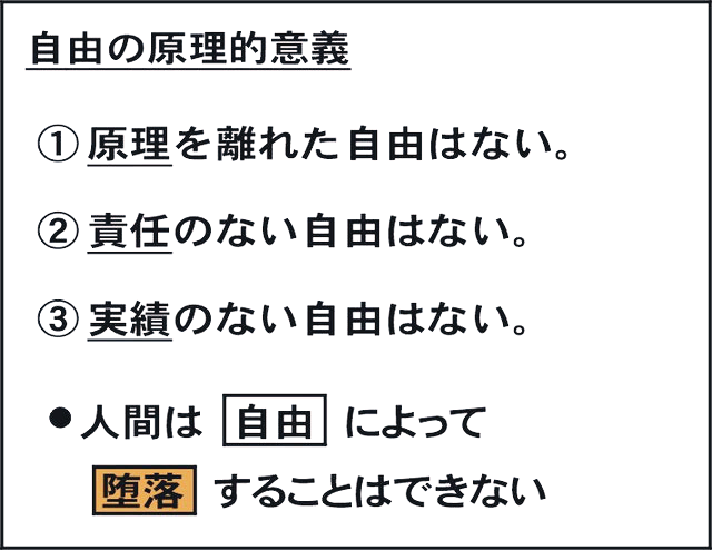 第二に、責任のない自由はあり得ない。原理によって創造された人間は、それ自身の自由意志をもって、その責任分担を完遂することによってのみ完成する(前編第一章第五節(二)②)。したがって、創造目的を追求していく人間は、常に自由意志をもって自分の責任を全うしようとするので、責任のない自由はあり得ないのである。