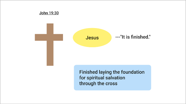 A second example is Jesus’ last words on the cross, “It is finished” (John 19:30). Jesus did not utter these words to mean that through the crucifixion he had completely accomplished the providence of salvation. After he realized that the people’s disbelief was unalterable, he chose the path of the cross in order to lay the foundation for spiritual salvation, leaving unfulfilled the task of achieving physical salvation until the time of the Second Advent. Hence, by the words, “It is finished,” Jesus meant that he had finished laying the foundation for spiritual salvation. By this time, it had become the alternative goal of the providence.