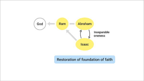 Since Isaac had carried the wood for the sacrifice, we can infer that he participated in the offering of the ram. Thus, even though it is written that Abraham made the symbolic offering, Isaac, who had united with Abraham and inherited his mission, was given providential credit for the offering. In this way, Isaac, having inherited Abraham’s mission, made the symbolic offering and restored through indemnity the foundation of faith.