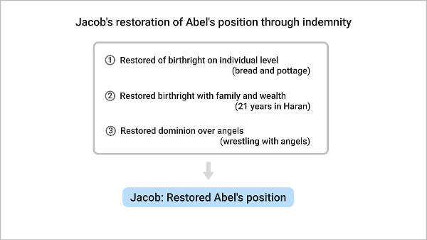 Third, on his way back to Canaan, the land of the promised blessing, Jacob triumphed in wrestling with an angel at the ford of Jabbok, thereby restoring dominion over the angel in a substantial struggle. Through these three victories, Jacob restored through indemnity the position of Abel. Thereupon, Jacob became the central figure of the substantial offering.