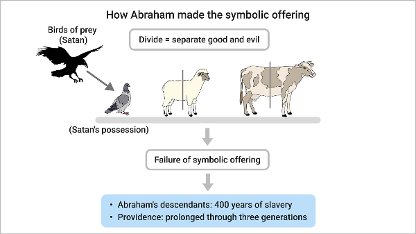 The dove, symbolizing the formation stage, remained in Satan’s possession. Consequently, Satan also claimed the ram, symbolizing the growth stage, and the heifer, symbolizing the completion stage, both of which were to be fulfilled based upon the formation stage. Since it had the effect of handing over the entire symbolic offering to Satan, not dividing the birds constituted a sin.