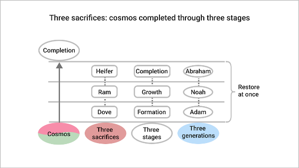 Why did Abraham place the three sacrifices – the dove and pigeon, the ram and goat, and the heifer, symbolizing the formation, growth and completion stages – on one altar? Before the Fall, Adam was responsible to grow through all three stages in his one lifetime. Similarly, Abraham, now in the position of Adam, was supposed to restore, all at once, the long providence which God had conducted through the three providential generations of Adam (formation), Noah (growth) and Abraham (completion). Through one offering, he could restore all the defiled conditions containing the number three. The symbolism of Abraham’s sacrifice reveals God’s Will to fulfill the entire providence of restoration once and for all.
