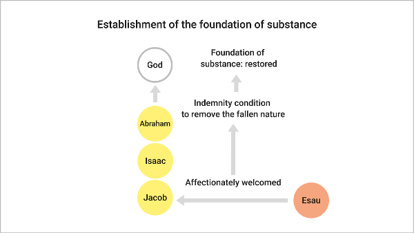 Indeed, when Jacob returned to Canaan with his family and wealth after enduring twenty-one years of hardship in Haran, he moved Esau to overcome his former hostility: And Jacob lifted up his eyes and looked, and behold, Esau was coming, and four hundred men with him. So he divided the children among Leah and Rachel and the two maids. And he put the maids with their children in front, then Leah with her children, and Rachel and Joseph last of all. He himself went on before them, bowing himself to the ground seven times, until he came near to his brother. But Esau ran to meet him, and embraced him, and fell on his neck and kissed him, and they wept (Gen. 33:1-4). When Esau opened his arms and affectionately welcomed Jacob, they fulfilled the indemnity condition to remove the fallen nature. For the first time, the foundation of substance was laid successfully.