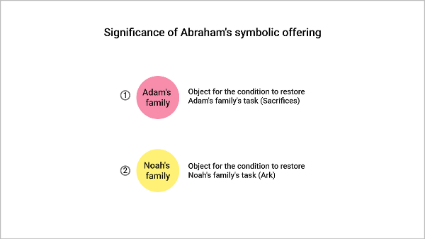 Since Noah was the second human ancestor, for Abraham to restore the position of Noah, he also had to assume Adam’s position. For this reason, he was required to make a symbolic indemnity condition to restore the position of Adam’s family before he could make the actual symbolic offering.