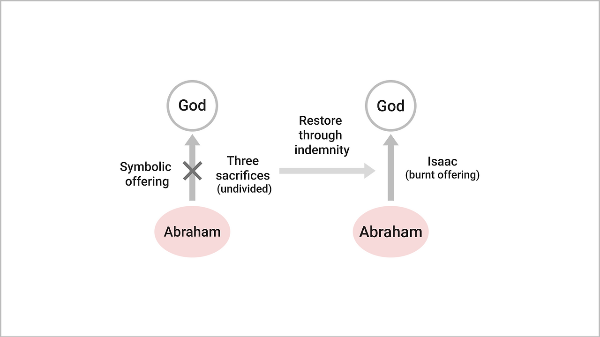 For this reason, Abraham was given the opportunity to fulfill a condition of indemnity, albeit at a greater price, and thereby make symbolic restoration of all he had lost when he failed in the earlier symbolic offering. This greater indemnity condition was the offering of his son Isaac as a sacrifice.