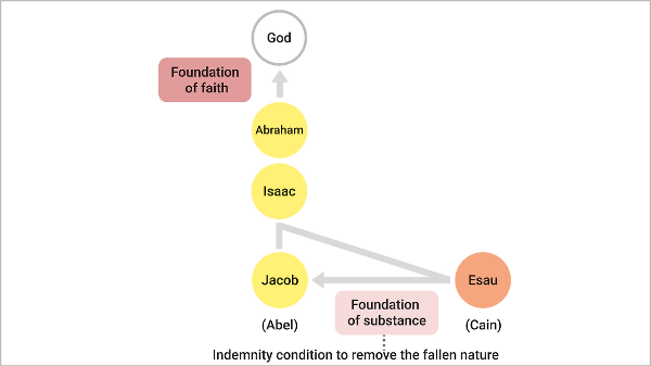 If Abraham had not failed in the symbolic offering, Isaac and his half-brother Ishmael would have stood in the positions of Abel and Cain. They would have been responsible to fulfill the indemnity condition to remove the fallen nature which Cain and Abel did not accomplish. However, because Abraham failed in the offering, God set up Isaac in the position of Abraham, and Esau and Jacob in the positions originally intended for Ishmael and Isaac. It was then up to Esau and Jacob to fulfill the indemnity condition to remove the fallen nature. For the purpose of making the substantial offering, Esau and Jacob were in the same positions under their father Isaac as Cain and Abel in relation to Adam, and as Shem and Ham in relation to Noah.