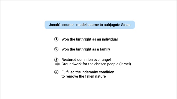After returning to Canaan with these victories, Jacob won Esau’s heart, and together they fulfilled the indemnity condition to remove the fallen nature. Jacob thus victoriously completed the model course to bring Satan to submission. Moses, Jesus, and even the people of Israel would walk this course after the pattern set by Jacob. The history of Israel can serve as a good historical source for understanding the course to bring Satan to submission on the national level. For this reason, it is central to the study of the providence of restoration.