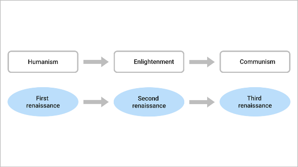 The Cain-type movement which began with the revival of Hellenism overthrew the medieval world and gave birth to the humanism of the Renaissance. As this movement developed further, moving in Satan’s direction, it gave birth to the Enlightenment, which may be regarded as the second renaissance in the current of ideology. Enlightenment thought further matured in the satanic direction, giving birth to historical materialism, which is the core of communist ideology. This may be regarded as the third renaissance.