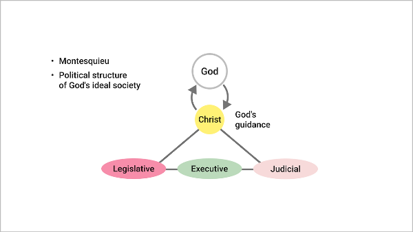 The concept of the separation of powers into three branches of government was advocated by Montesquieu (1689-1755), a leading thinker of the Enlightenment. It sought to prevent the concentration of political power in the hands of a single individual or institution, as was the case with political absolutism. The idea was proclaimed in the Declaration of the Rights of Man during the French Revolution. From the beginning, the separation of powers was to be characteristic of the political structure of the ideal society which God has been working to realize. Yet here again, as we observe throughout the course of the providence, Satan was defectively mimicking an aspect of the Principle ahead of its realization by God.