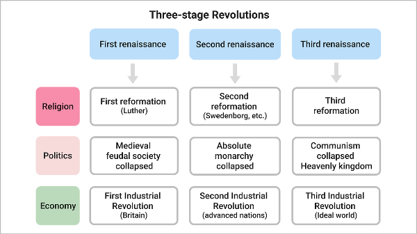 Since the satanic side mimics in advance the providence of God, we may expect that God’s providence calls for three stages of revolution to take place in each of the three spheres of religion, politics and economy. In the sphere of religion, the first reformation took place under Martin Luther’s leadership after the first renaissance. A second reformation was launched after the second renaissance by the spiritual movements led by people such as the Wesley brothers, Fox and Swedenborg. From our examination of the progress of history, it is evident that a third reformation will occur following the third renaissance. Indeed, the state of today’s Christianity desperately calls for such a reformation.