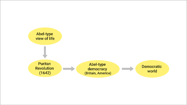 Born out of the Abel-type view of life, Abel-type democracy has developed from these beginnings into the democratic world of today.