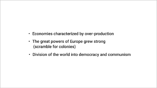 Following the Industrial Revolution, spurred by the rapid progress of science, industrialization created economies characterized by over-production. The great powers of Europe, which felt an urgent need to pioneer new lands as markets for their products and as sources of raw materials for their factories, grew strong as they competed with each other in the scramble for colonies. Thus, two factors – the two trends in ideology and the course of economic development following the progress of science – caused the later political division of the world into two blocs: the democratic world and the communist world.