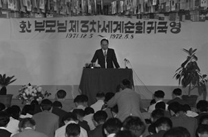 | 참부모님 생애노정 - 5권 제2차 7년 노정 제4절 1971년 통일기반 확보 7. 참부모님 제3차 세계순회 1971.12.5. ~ 1972.5.8.,15개 국, 최원복, 김영휘수행 제3차 세계순회의 목적 777가정을 중심삼고 세계의 가정을, 세계의 종족권을 이루는 어예요. 민족적 각 종교, 각 씨족을 초월한 입장에서 이 기반을 닦은 후에 세계 상대권을 중심삼고 이 세계 종족권을 연결하기 위한 것이 쓰리 세븐(three seven)777가정입니다. 이것으로서 결혼하는 건 다 끝난 거예요. 선생님이 한 번, 3가정이 한 번, 36가정이 한 번, 72가정이 한 번, 124가정이 한 번, 430가정이 한 번, 777가정이 한 번 해서 7수가 다 끝난 거예요. 이래서 세계 종족 편성기반을 완성했다는 겁니다. 이럼으로 말미암아 세계의 어떠한 민족이든지 통일교회에 들어올 수 있는 길이 열렸다구요. 여기서부터 세계 섭리를 하는 겁니다. 그때가 70년대지요? 70년대입니다. 그때를 중심삼고 이 기반을 닦았기 때문에 선생님의 세계적 진출이 가증했던 것입니다. 그래서 세계무대로 배 타고 나간 거예요. 그것을 하려면 여러분들은 국가적 재탕감을 해야 됩니다. 한국 민족이 바대하고... . 전부 다 재탕감을 해야 됩니다. 우리 가정들이 재탕감해야 됩니다. 가정복귀 기반을 닦아야 되기 때문에 3년 동안 전부 내쫓는 거예요. 돈만 갖추면 사람은 얼마든지 있는 것입니다. 돈을 어떻게 벌 것이냐? 일본 식구들을 통해 가지고 경제적인 문제를 해결하려고 합니다. 이번이 제3차 순회노정이니만큼, 여러분은 모르겠지만 선생님이 세계적인 계획을 하고 있습니다. 지금까지는 한국 기독교를 구하려고 했지만 앞으로는 한국 기독교보다도 세계 기독교와 미국을 구해 주어야 되는 것입니다. 그러므로 앞으로는 새로운 각도로 방향을 전개시켜 가지고 국제적인 활동을 준비하려고 그래요. 그렇게 하기 위해서는 상당한 자원이 필요합니다. 자원이 필요해요. 현재 각 강사들이나 젊은 사람들은 준비해 놓으라구요. 멀지 않은 장래에 한국을 대표한 세계적인 부흥단이 출현할 때가 올 것입니다. 전세계를 대표한 세계적인 부흥단이 세계를 순방함과 더불어 국가를 대표한 부흥단이 세계를 순방할 수 있는 조직을 불원한 장래에 만들 것입니다. 그리하여 몇 개 국의 부흥단이, 한팀이 되어 가지고도 할 것이고, 혹은 몇 개 국이 일시에 세계를 공격하는 작전을 하려고도 합니다. 그래서 이번에 순회를 가게 되면 못해도 40개 국 이상에 선교부를 설치하고 돌아와야 할 사명을 느끼고 있습니다. 그리고 몇 년 이내에 120개 이상의 나라에 선교부를 어떻게 만드느냐 하는 문제가, 금후에 통일가가 해야 할 사명인 것을 여러분이 알아야 되겠습니다. 순회기간 중 한국식구들의 임무 1971.11.5. ~ 11.7., 출발전 전국순회대집회 이번 선생님이 없는 기간에 여러분이 첫째 뭘해야 하느냐 하면 여 러분이 하나 되어 기도하라는 것입니다. 선생님이 이 나라 이 민족을 대하여 기도하던 것과 마찬가지로, 선생님이 없기 때문에 여러분이 대신 지키는 의미에서 정성을 들여 앞으로 남북이 통일될 수 있는 그날을 위하여 내적으로 외적으로 결속하고, 하늘과 더불어 다짐하고 기도 시간을 갖기를 바라는 것입니다. 둘째는 여러분이 남한 각지 어떤 곳에서도 통일교회를 모르는 사람이 없도록 선전을 해야 되겠습니다. 밤이나 낮이나 쉬지 않고 이 짧은 기간 내에 선전을 해야 되겠습니다. 원래는 각 종단들과 힘을 합하여 그 일을 해야 할 텐데도 불구하고 그렇게 하지 못하기 때문에 우리들이 배가의 삽자가를 지고 놀음을 해야 하는 것입니다. 이렇게 해서 이 민족이 갈 방향을 제시해야 할 사명이 있기 때문에, 우리만이라도 이 놀음을 하지 않으면 갈 길 없기 때문에, 이러한 비운의 운명을 가리기 위해서는 온갖 지성을 다하여 여러분의 일신에 고달품이 있더라도 그것을 넘어서서 책임을 다해 주기를 부탁하는 바입니다. 그 다음에는 지금 일선에 나가 있는 전도대원들과 교회장이 하나 안 되어 있다구요. 하나 되지 않는 사이에 뭐가 있거든 여러분이 찾아가서 전부 다 풀라는 것입니다. 기도하고 나가서 활동하고 부딪치면서, 될 수 있으면 사이가 안 좋은 사람끼리, 옛날에는 원수였고 혹은 반대하던 사람들을 데리고 나가서 같이 활동하면서 하나가 되라는 것입니다. 일을 놓고 하나가 되고, 나라를 놓고 하나가 되라는 것입니다. 미국 입성까지의 난관 타개 1971.12.5. ~ 12.18. 우리가 맨 처음 한국에서 일본으로 출발할 때에, 비상사태를 선언하기 바로 전날 떠났다구요. 가만 보니까 사태가 절박하다는 거예요. 그래서 출발하려고 하는데 주일날이라 수속을 못한 거예요. 외무부 여권과 과장의 결재를 받아 놓아야 되는 것을 못 받아 놓았다구요. 주일날이라도 나가야 할 텐데 인증서가 없기 때문에 못 나가게 됐다구요. 큰일 났거든요. 그래 가지고 그 시간에 전부 다 기다리고 있는 거예요. 그런데 30분에 전에 여권과 과장을 만난 거라구요. 그것이 하늘의 역사라구요. 그 여권과 과장은 주일이니만큼 자기 과원들을 데리고 청평 호수에 놀러 가려고 약속해 놓았어요. 그래 과장이 아침에 일어나 가려고 하니까 몸이 찌뿌드드 하고 아, 