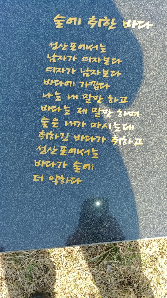 성산포구로 가는 바닷가 잔디위에 검은 대리석에 새겨진 시구절詩句節.
