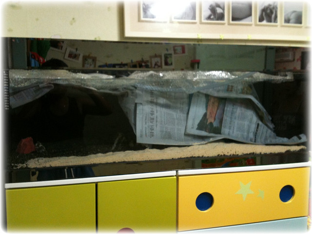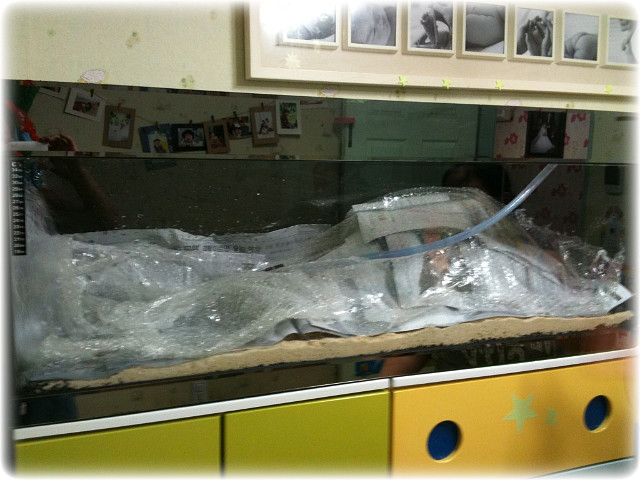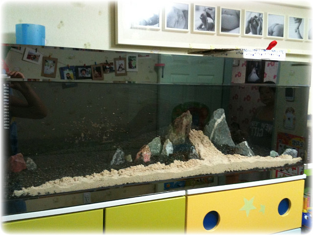 우선 어디에 놓을지;;; 마눌님 눈치를 보다가 아이방 2자 어항을 치우고 그자리에 놓기로 결정.