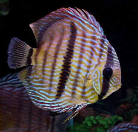 Heckel Discus (Symphysodon Discus) - Found in mostly Brazil's Rio Negro, this fish has a distinguishing dark "fifth" stripe and has both red and blue varieties. It's named after ichthyologist Johann Jacob Heckel and is the most difficult discus to keep, because it likes somewhat softer (and lower pH) and warmer water than the other species. It has two subspecies, the Blue Head Symphysodon Discus Discus - which has a blue head (obviously!), and the Symphysodon Discus Willischwartzi.