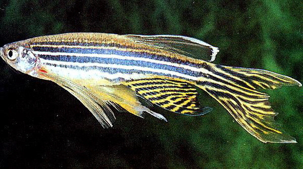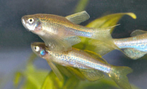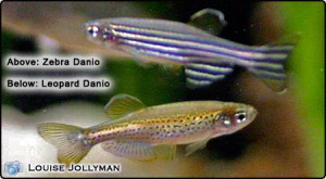 ▲ 제브라 다니오와 레오파드 다니오 / 우측 사진은 제브라 다니오의 유전자 변형개체인 글로피쉬(glo fish)