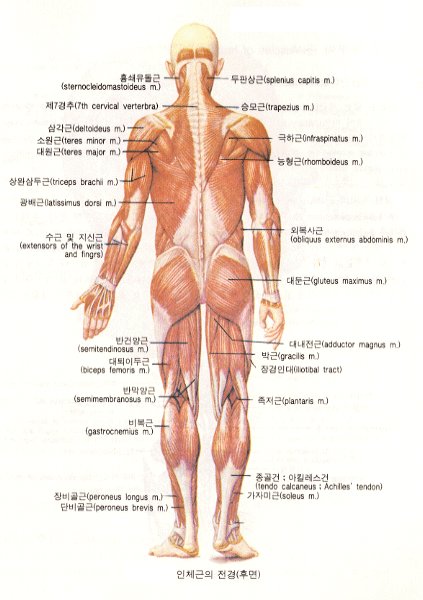 □ 삼각근은 3개의 근육으로 구성되는데 어깨앞쪽의 전면삼각근, 어깨중간의 중간삼각근, 그리고 어깨후면의 후면삼각근이 그것이다. 삼각근은 흔히 어깨근육이라고 불리는 부분인데 모양이 삼각형으로 생겼다. □ 광배근은 한자로 넓을광,등배자로 넓은 등이라는 뜻이다. 광배근은 우리가 외모적으로 보았을 때 역삼각형을 만들어주는 근육이다. 역삼각형으로 된 상체는 멋있게 보인다. □ 승모근은 목과 어깨사이의 근육으로 어깨를 으쓱할 때 사용되는 근육이다. 흔히 오랫동안 컴 퓨터작업을 하고 있으면 뭉쳐서 뻐근해지는 부위입니다. □ 극상근은 승모근아래에 위치하고 있으며 어깨관절의 안정성을 유지시킨다. □ 극하근,소원근,대원근등은 대략 어깨죽지부근에 올망졸망 모여있는 잔잔한 근육들이다. □ 능형근은 견갑골사이에 위치한 근육이며 흔히 팔을 벌려 가슴을 쫙펼때 수축되는 근육이 다. □ 척추기립근은 골반에서 머리까지 척추선을 따라 연결되어있는 척추를 지지하고 있는 방대한 근 육무리이다. □ 삼두박근은 팔뒷면 근육이죠. 팔을 쭉 폈을 때 말굽모양처럼 보여지는 근육이다. □ 전완신근은 전완굴근과는 반대개념의 근육이다. 손목을 펼 때 사용되는 근육이다. □ 엉덩이 근육무리에는 대둔근,중둔근,소둔근의 3가지 근육이 있다. 일반적으로 엉덩이를 덮 고 있는 근육이 대둔근이며 가장 크다. 그리고 그 윗편에는 중둔이 그리고 대둔근 아래에는 소둔근이 있다. □ 대퇴근막장근은 외전근에 속하며 다리를 바깥으로 벌릴 때 사용되는 근육이다. □ 슬와근무리는 대퇴사두근과 정반대의 기능을 하는 근육무리이다. 무릎을 구부릴 때 사용되는 근육으로써 대퇴이두근,반막양근,반건양근으로 구성되어 있습니다. □ 종아리근육에는 비복근과 가재미근이 있다. 일반적으로 보여지는 종아리근육은 바로 비복 근이다. 그리고 그 아래에는 일부 비복근에 덮여서 맨 아래 아킬레스건에 연결된 가재미근이 있습니다. □ 장비골근과 단비골근은 전경골근의 반대근육이다. |