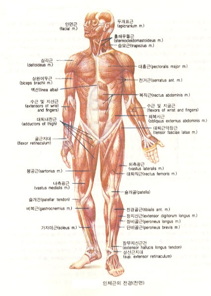 □ 대흉근은 손으로 직접 만져지는 가슴근육의 맨바깥 쪽부분이다. □ 상완이두근은 흔히 이두박근이라고 말하는 근육이다. 손바닥을 위로보게 한뒤 팔을 구부리면 알통이 뽈록 솟죠. 그것이 바로 상완이두근이다. □ 복부주변의 근육에는 복직근,내.외복사근,복횡근이 있다. 흔히 말하는 복근은 바로 복직근 이며 중앙 복직근 옆에는 외복사근이 있다. 외복사근 안쪽에는 내복사근이 있으며 보이지 않는다. 그리고 가장 복부안쪽에는 복횡근이 자리잡고 있다. □ 전완굴근은 일반적으로 손목을 구부릴 때 관련되는 근육의 총칭입니다. □ 대퇴사두근무리에는 대퇴직근,내측광근,외측광근,중간광근의 서로다른 4개의 근육들이 있다. 대 퇴직근은 무릎에서 골반까지 연결된 유일한 근육이며 그외의 3개근육들은 무릎에서 대퇴골까 지만 연결되어있다. 허벅지전면의 약간 안쪽부분이 내측광근이며 약간 바깥쪽이 외측광근이 다. 그리고 중간광근은 허벅지중앙부분에 있으며 대퇴직근에 가려서 보이지 않는다. □ 내전근 무리는 다리를 안쪽으로 모을 때 사용되는 근육들이다. 허벅지에서 가장 안쪽부분이 며 다리를 모을 때 서로 붙는 부분이다. □ 전경골근은 종아리 맨 앞쪽이다. 발끝을 들 때 사용된다.