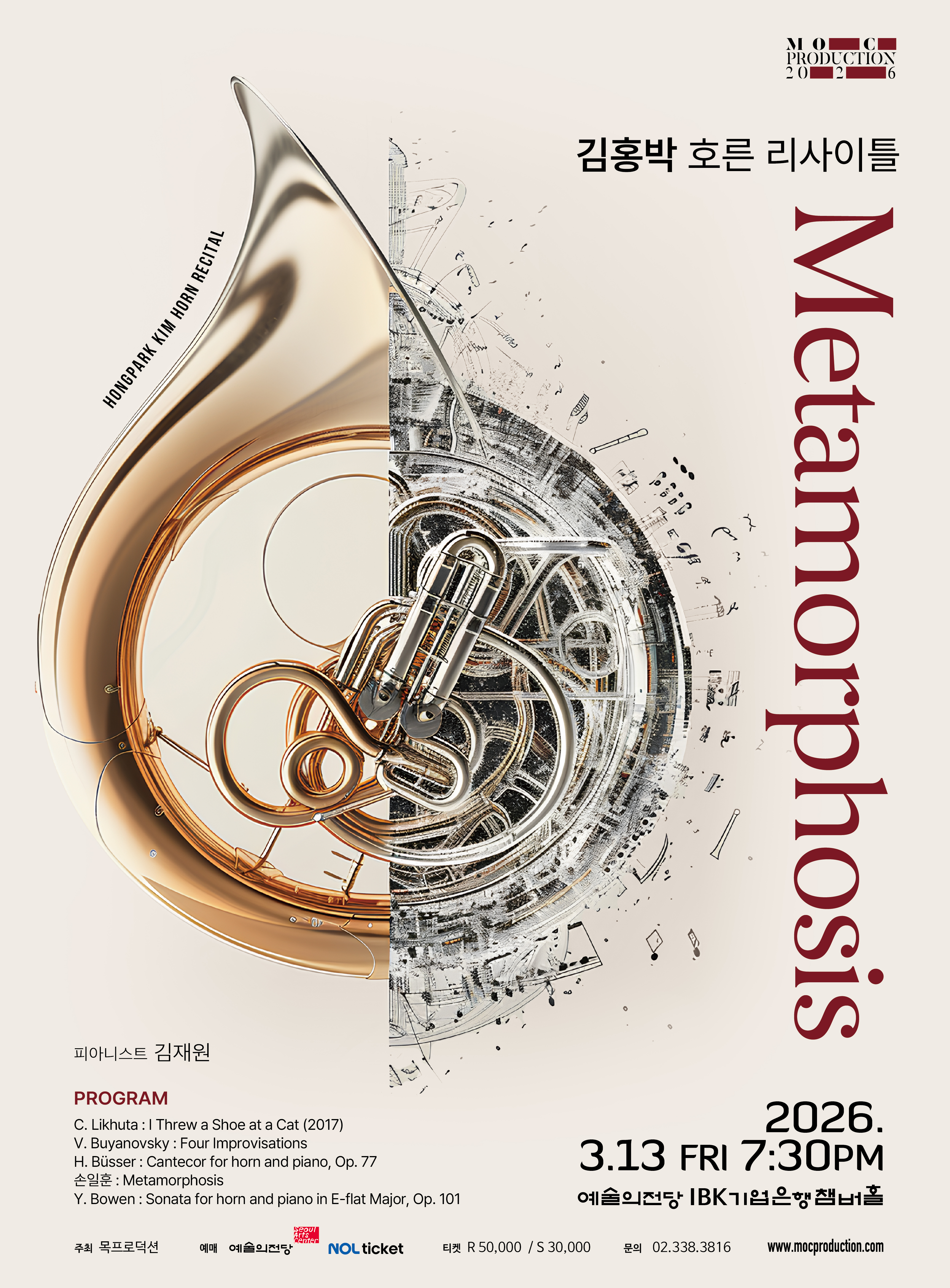 이번 리사이틀의 부제 ‘Metamorphosis(변신)’는 한 악기의 음색과 역할이 변화해온 과정을 넘어, 우리가 ‘주류’라고 여겨온 음악사의 지형 자체가 어떻게 바뀌어 왔는가에 대한 질문을 품고 있다. 전통적으로 독일·오스트리아 중심의 레퍼토리가 호른 음악의 핵심으로 인식되어 왔다면, 이번 무대는 시대와 국적을 가로지르는 근·현대 작품들을 한자리에 모아, 서로 다른 언어의 음악들이 어떻게 하나의 호흡으로 연결되는지 보여준다. 그 과정에서 호른은 ‘전통적인 금관’이라는 고정된 이미지를 벗고, 때로는 유머러스한 제스처로, 때로는 즉흥과 서정의 얼굴로, 또 때로는 새롭게 탄생한 동시대의 목소리로 변신하며 자신만의 현재형을 완성한다.