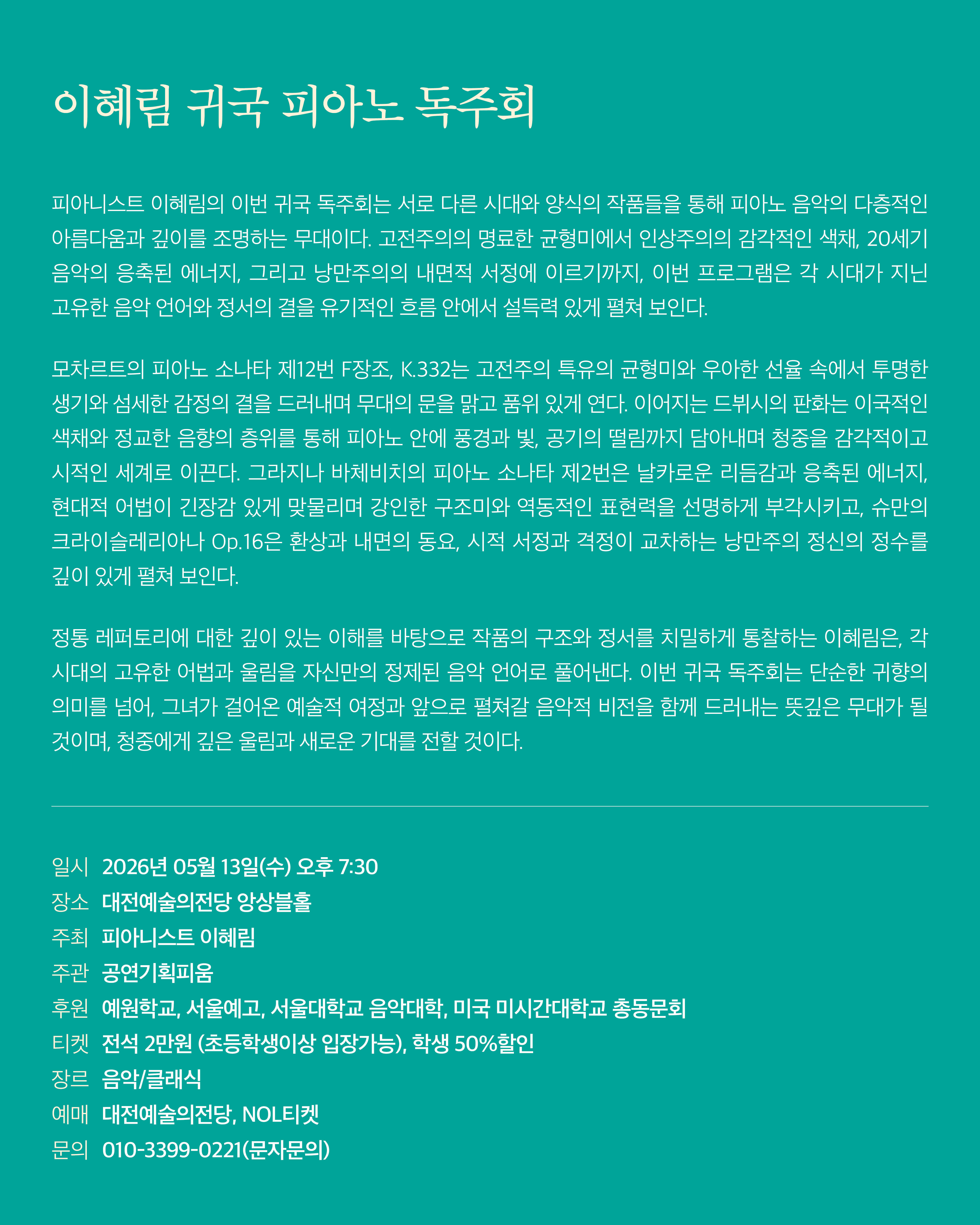 #피아니스트이혜림 #이혜림귀국독주회 #이혜림독주회 #모차르트 #슈만 #드뷔시 #바체비치 #대전예술의전당 #대전예당 #공연기획피움 #PIUMPLANNING