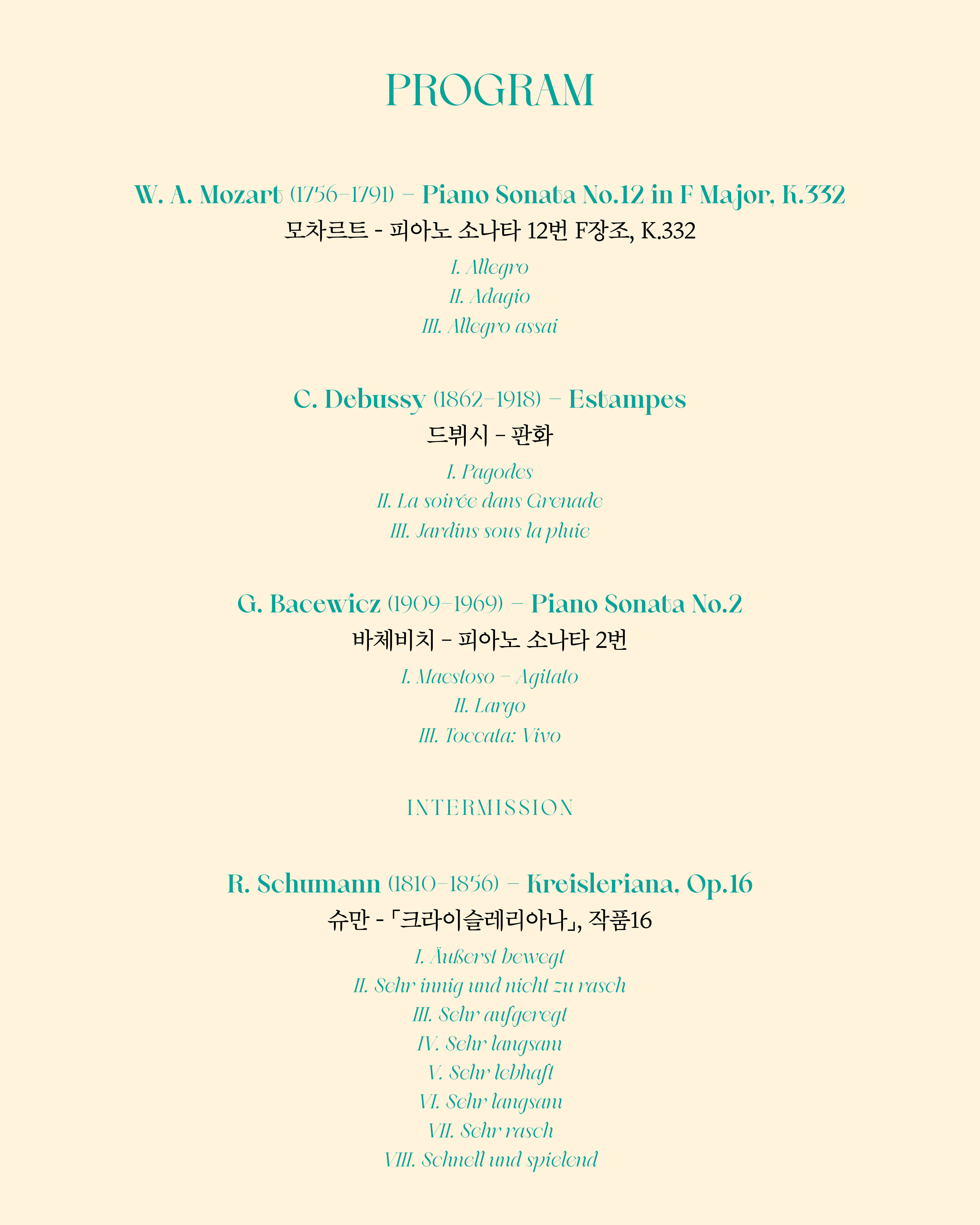 모차르트의 피아노 소나타 제12번 F장조, K.332는 고전주의 특유의 균형미와 우아한 선율 속에서 투명한 생기와 섬세한 감정의 결을 드러내며 무대의 문을 맑고 품위 있게 연다. 이어지는 드뷔시의 판화는 이국적인 색채와 정교한 음향의 층위를 통해 피아노 안에 풍경과 빛, 공기의 떨림까지 담아내며 청중을 감각적이고 시적인 세계로 이끈다. 그라지나 바체비치의 피아노 소나타 제2번은 날카로운 리듬감과 응축된 에너지, 현대적 어법이 긴장감 있게 맞물리며 강인한 구조미와 역동적인 표현력을 선명하게 부각시키고, 슈만의 크라이슬레리아나 Op.16은 환상과 내면의 동요, 시적 서정과 격정이 교차하는 낭만주의 정신의 정수를 깊이 있게 펼쳐 보인다.