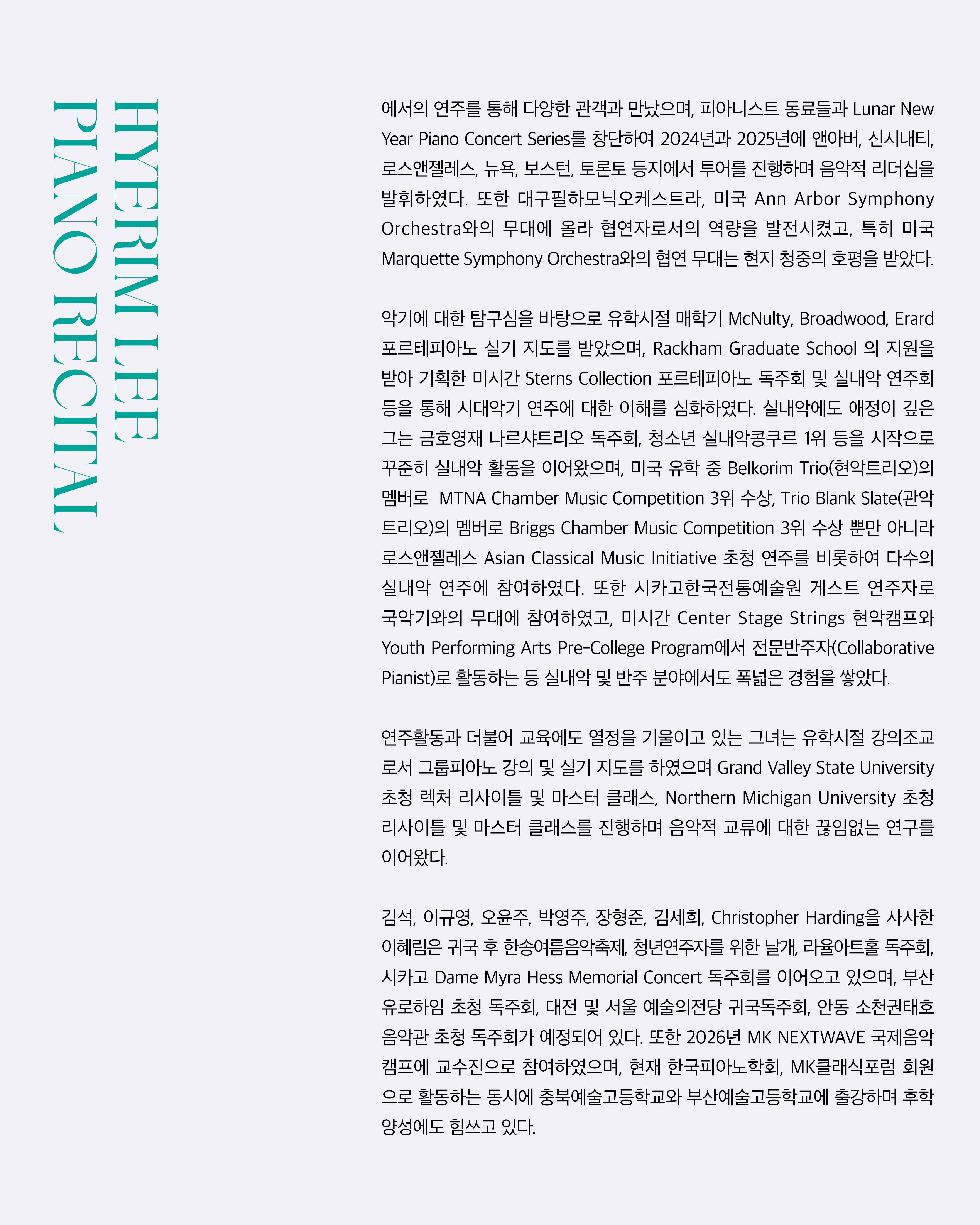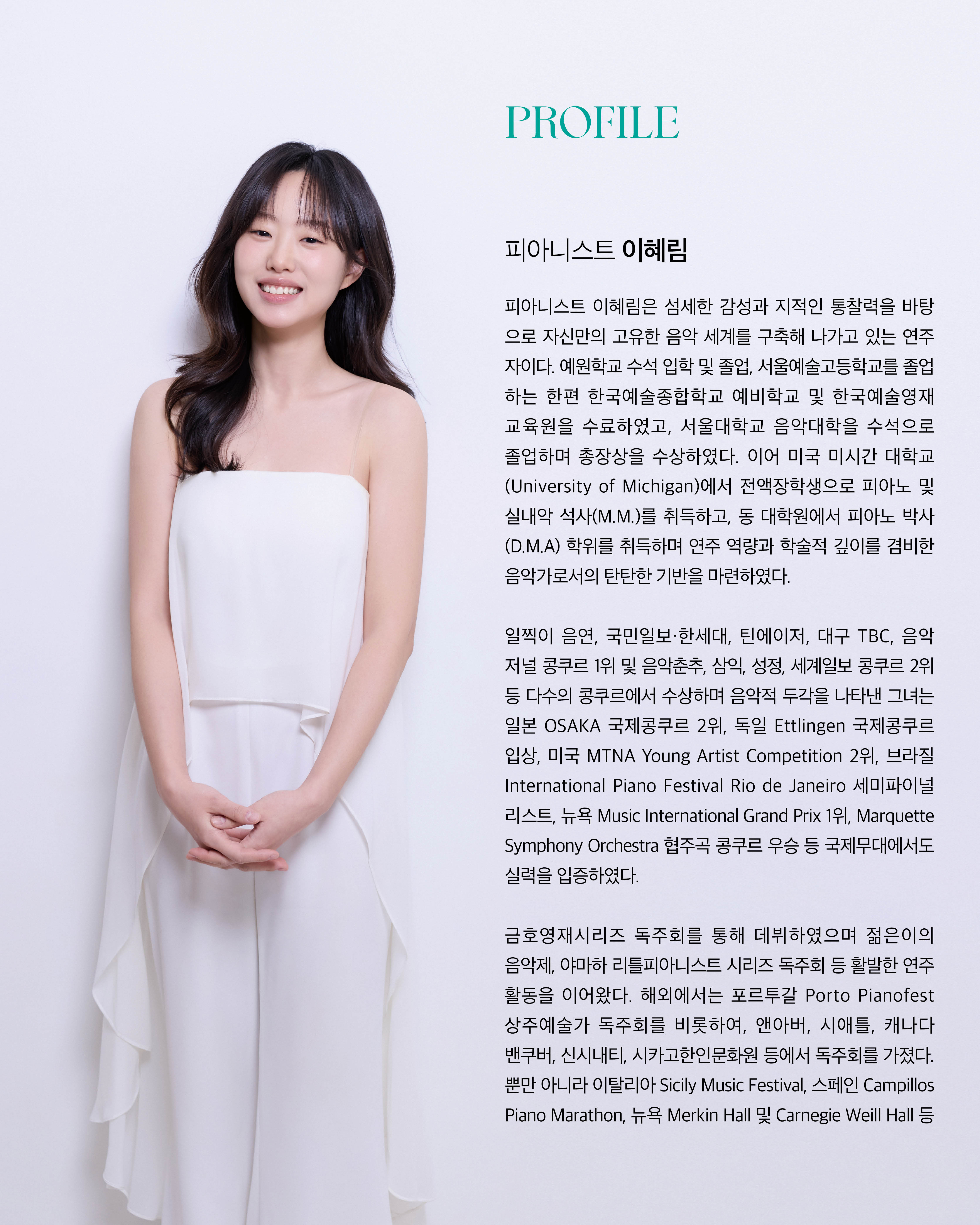 정통 레퍼토리에 대한 깊이 있는 이해를 바탕으로 작품의 구조와 정서를 치밀하게 통찰하는 이혜림은, 각 시대의 고유한 어법과 울림을 자신만의 정제된 음악 언어로 풀어낸다. 이번 귀국 독주회는 단순한 귀향의 의미를 넘어, 그녀가 걸어온 예술적 여정과 앞으로 펼쳐갈 음악적 비전을 함께 드러내는 뜻깊은 무대가 될 것이며, 청중에게 깊은 울림과 새로운 기대를 전할 것이다.
