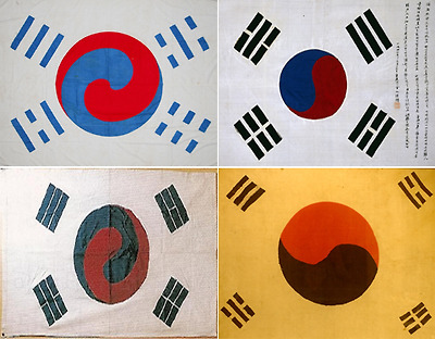 - 왼쪽 위부터 시계방향으로 데니 태극기(1890년경), 김구 서명문 태극기(1941년), 버스비어 태극기(1950년), 아스토리아 호텔 태극기(1930년대).