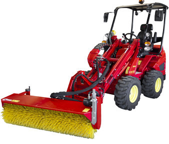 일반적인 스위핑 브러시(위 사진)은 트랙터나 로더의 앞에 장착되어 시계 방향으로 회전하는 솔이 파일을 세워주고 뭉쳐있는