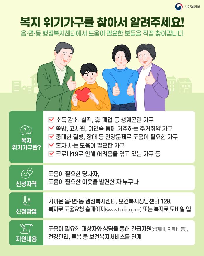 복지위기가구 '복지로' 서비스이용 안내 작성자꿈드림|작성시간22.01.11|조회수31 목록 댓글 0 글자크기 작게가 글자크기 크게가 복지위기가구들이 '복지로 도움요청'을 이용할 수 있도록 안내 및 홍보 부탁드립니다. 주변을 둘러보시고 도움이 필요한 분들에게 안내해주세요! 다음검색 현재 게시글 추가 기능 열기 북마크 공유하기 신고 센터로 신고 댓글 댓글 0 댓글쓰기 답글쓰기 댓글 리스트